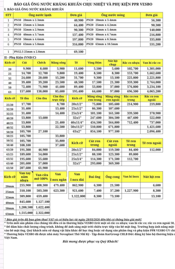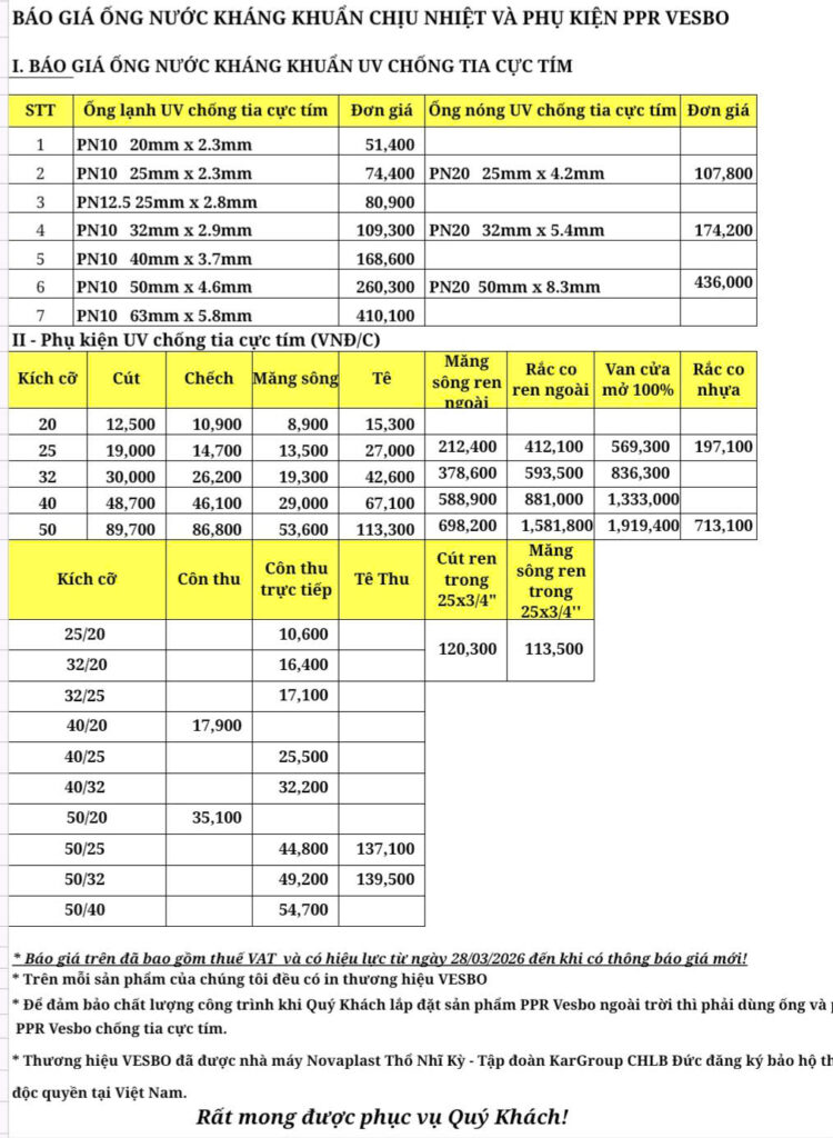Bảng giá ống nhựa PPR Vesbo và Phụ kiện mới nhất năm 2026