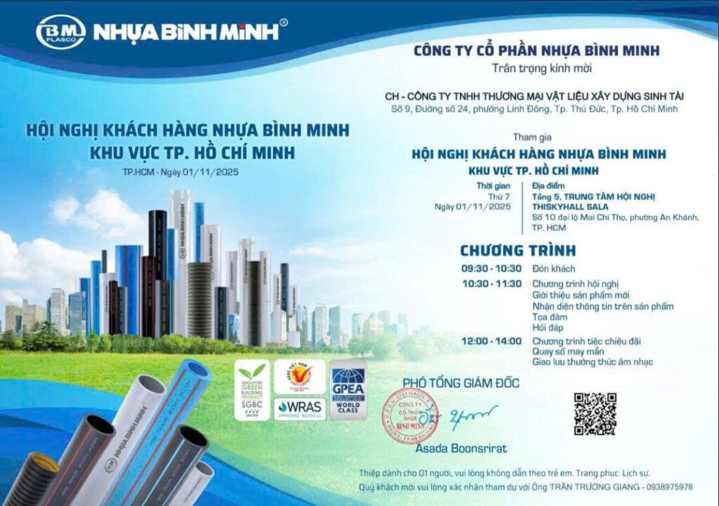 Hội nghị Khách hàng Nhựa Bình Minh khu vực TP.HCM ngày 1/11 vừa qua là “đại tiệc tri ân” đầy ấn tượng, nơi Quý Nhà phân phối, Cửa hàng và Quý Khách hàng cùng trải nghiệm không gian trưng bày các dòng ống nhựa PVC-U – Ống Nhựa PPR – Ống Nhựa PPR kháng UV- Ống nhựa HDPE, cùng nhiều phụ kiện và sản phẩm mới chất lượng cao đạt chứng nhận SGBP cấp độ Dẫn đầu. Sự kiện còn mang đến những chia sẻ chuyên sâu từ các chuyên gia của Nhựa Bình Minh về hành trình phát triển, các sản phẩm mới, giải pháp chống hàng nhái và định hướng phát triển bền vững trong tương lai.