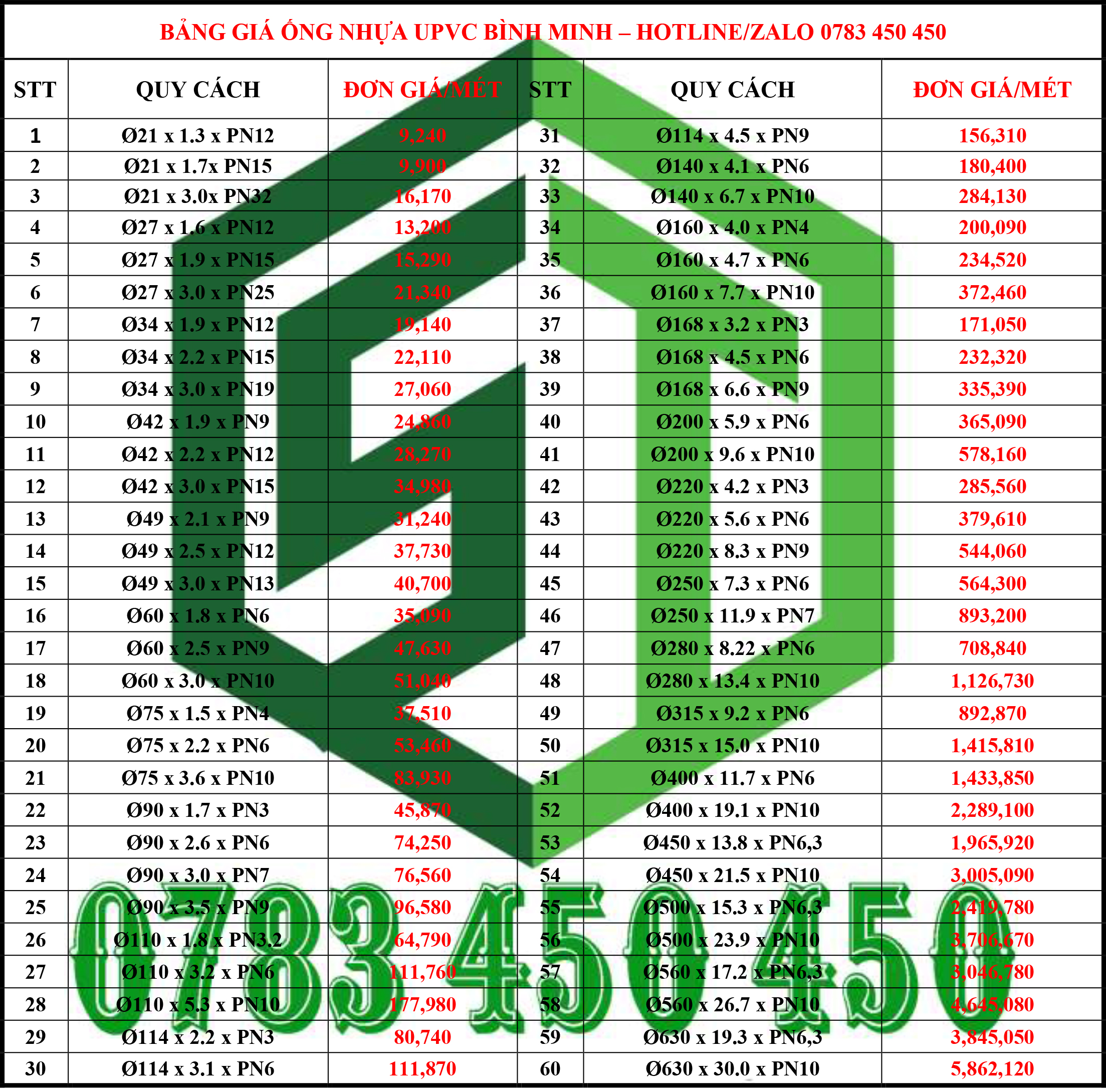 * Quý khách hàng vui lòng liên hệ qua Hotline/Zalo: 0783 450 450 để được báo giá tốt – Bảng giá ống nhựa uPVC Bình Minh và Phụ kiện​ Mới Nhất >>> CLICK XEM – Bảng giá ống nhựa PPR Bình Minh và Phụ kiện​ Mới Nhất >>> CLICK XEM – Bảng giá ống nhựa PPR Vesbo và Phụ kiện​ Mới Nhất >>> CLICK XEM Công ty chúng tôi chuyên cung cấp và giao hàng tại khu vực Phía Nam…